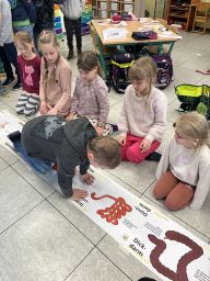 Am 7. November erhielten wir den zweiten Besuch von Frau Mertes, der Gesundheitsförderin. Dieses Mal ging es um unsere Nahrung und vor allem um den Weg, den unsere Nahrung zurücklegt. Die Stunde stellte eine gute Mischung aus Theorie und praktischen Übungen dar- die Schüler/innen durften selbst als Nahrung die verschiedenen Stationen durchlaufen und dabei die Merksprüche laut wiederholen. Mit Hilfe eines Bindfadens wurde demonstriert, wie lang unser Dünndarm eigentlich ist. Auf einem Arbeitsblatt wurden die wichtigen Verdauungsorgane noch einmal richtig sortiert. Es war ein lehrreicher und zugleich spannender Einblick in die Stationen unserer Verdauung.